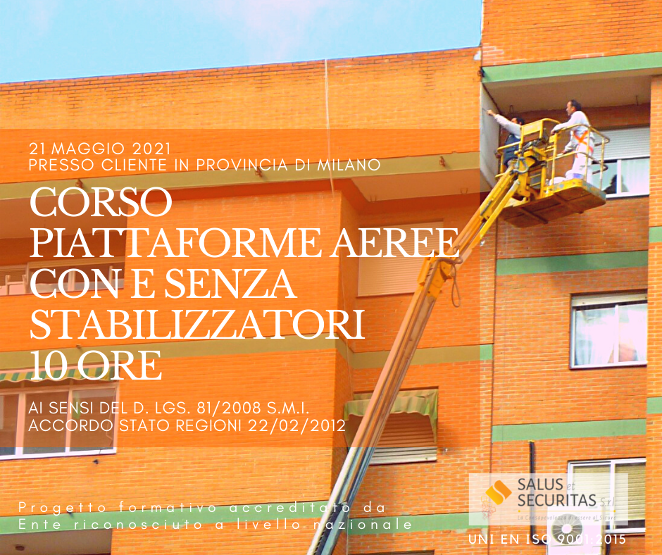 Corso Piattaforme Aeree con e senza Stabilizzatori dalla durata di 10 ore, ai sensi del D. Lgs. 81/2008 s.m.i. e dell’Accordo Stato Regioni del 22/02/2012, presso Cliente in provincia di Milano il giorno 21 Maggio 2021.