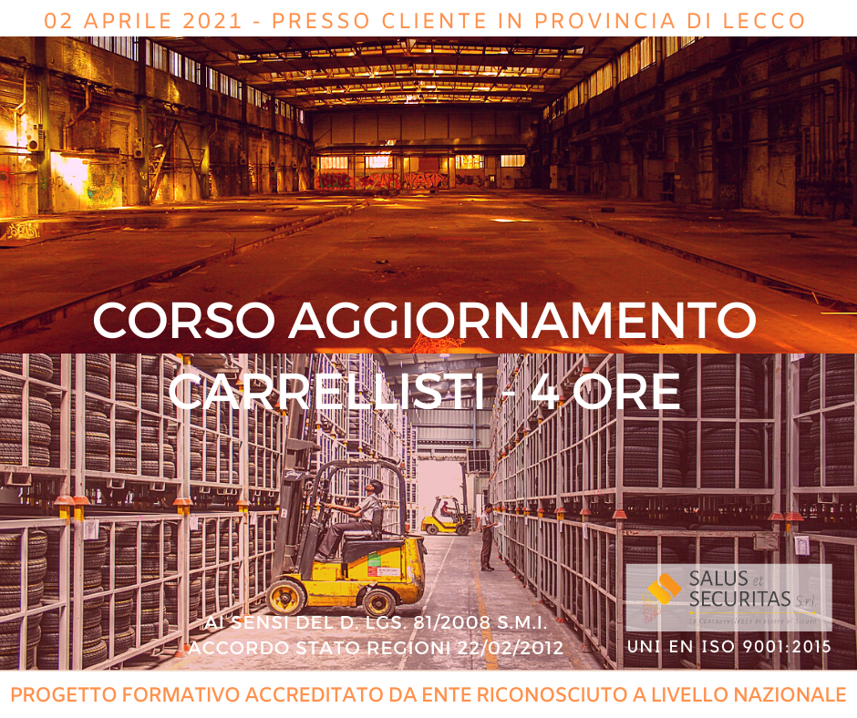 Corso Carrellisti Uomo a Bordo dalla durata di 12 ore, ai sensi del D. Lgs. 81/2008 s.m.i. e dell’Accordo Stato Regioni del 22/02/2012, presso Cliente in provincia di Piacenza nei giorni 08 e 09 Aprile 2021.