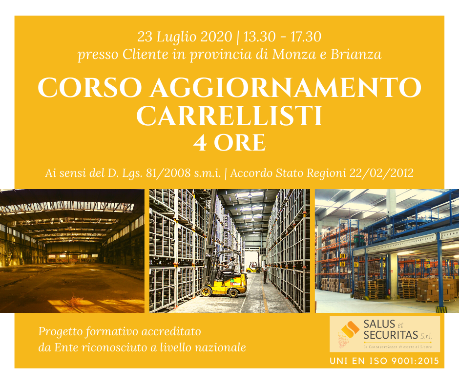 Corso Carrellisti Uomo a Bordo dalla durata di 12 ore, ai sensi del D. Lgs. 81/2008 s.m.i. e dell’Accordo Stato Regioni del 22/02/2012, presso Cliente in provincia di Milano nei giorni 10, 11 e 13 Agosto 2020.
