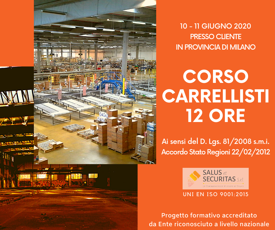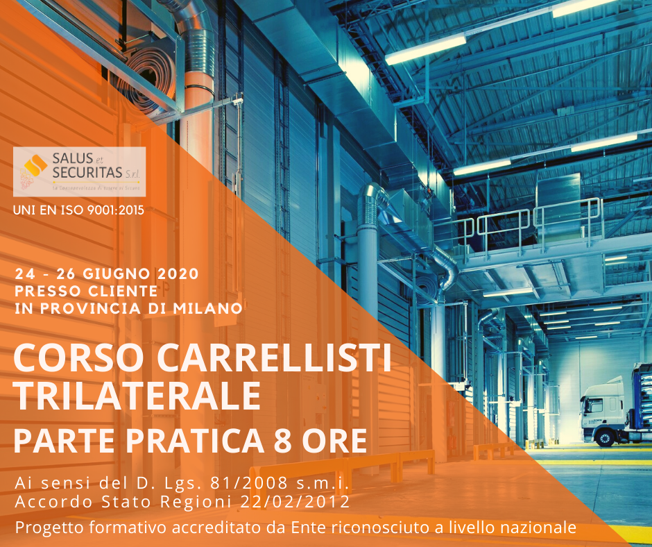Corso Carrellisti Trilaterale dalla durata di 16 ore, ai sensi del D. Lgs. 81/2008 s.m.i. e dell’Accordo Stato Regioni del 22/02/2012, parte pratica 8 ore presso Cliente in provincia di Milano nei giorni 24 e 26 Giugno 2020.