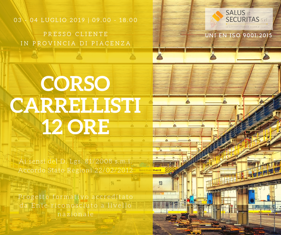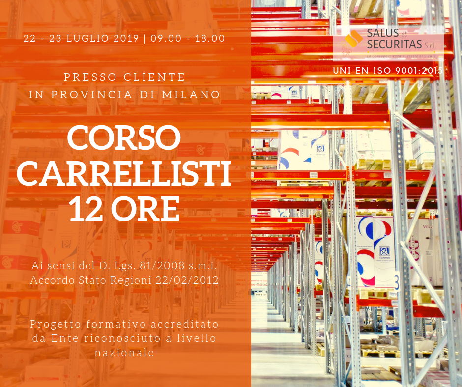 Corso Carrellisti Uomo a Bordo dalla durata di 12 ore, ai sensi del D. Lgs. 81/2008 s.m.i. e dell’Accordo Stato Regioni del 22/02/2012, presso Cliente in provincia di Milano nei giorni 29 e 30 Luglio 2019.