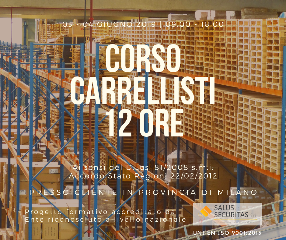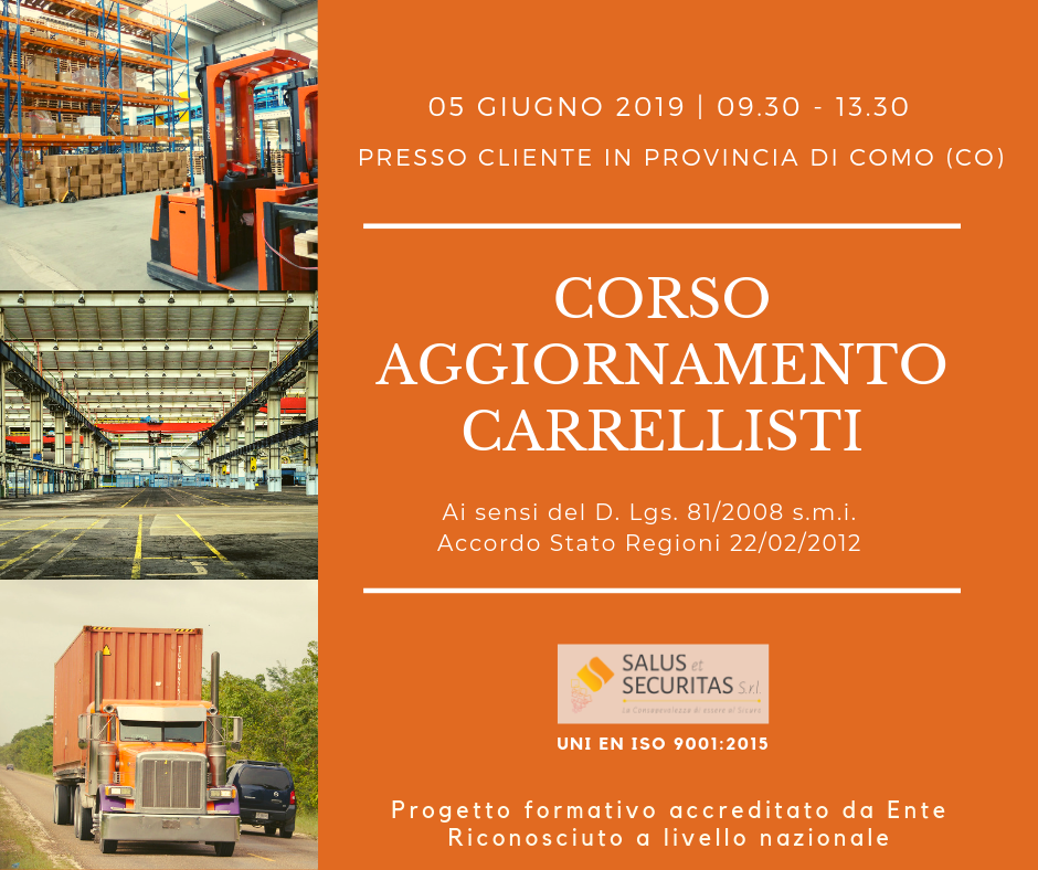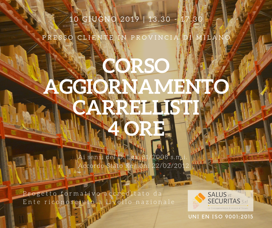 Corso Aggiornamento Carrellisti Uomo a Bordo dalla durata di 4 ore, ai sensi del D. Lgs. 81/2008 s.m.i. e dell’Accordo Stato Regioni del 22/02/2012, presso Cliente in provincia di Milano il giorno 10 Giugno 2019.