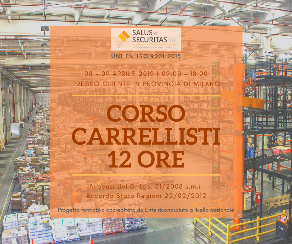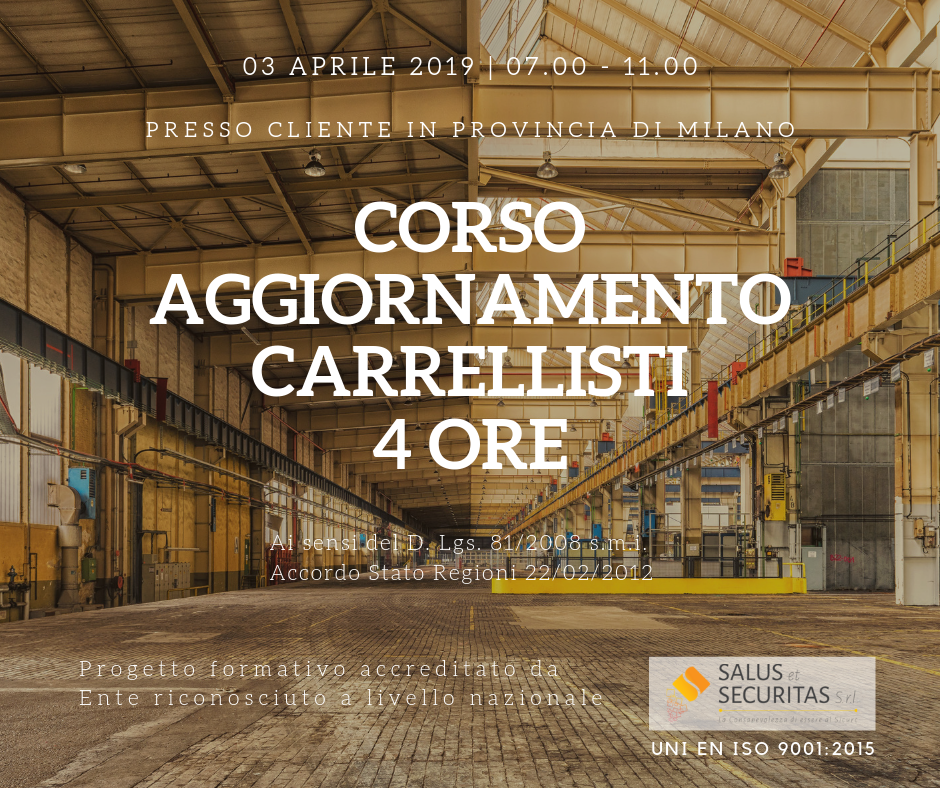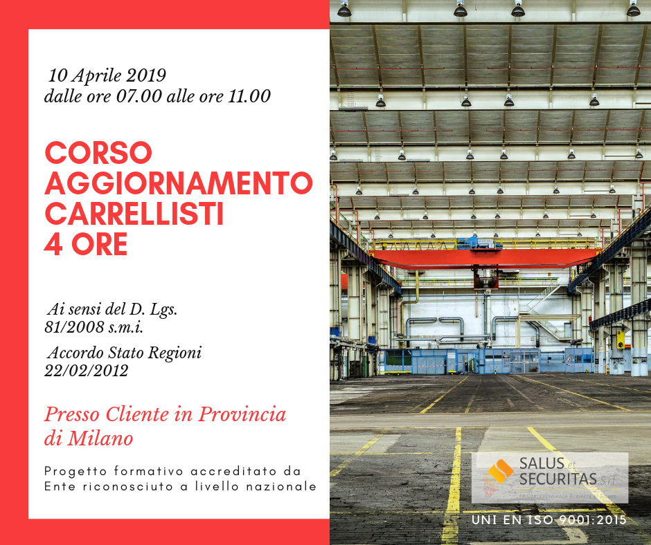 Corso Aggiornamento Carrellisti Uomo a Bordo dalla durata di 4 ore, ai sensi del D. Lgs. 81/2008 s.m.i. e dell’Accordo Stato Regioni del 22/02/2012, presso Cliente in provincia di Milano il giorno 10 Aprile 2019.