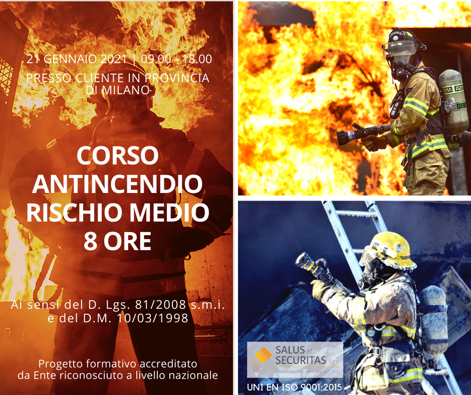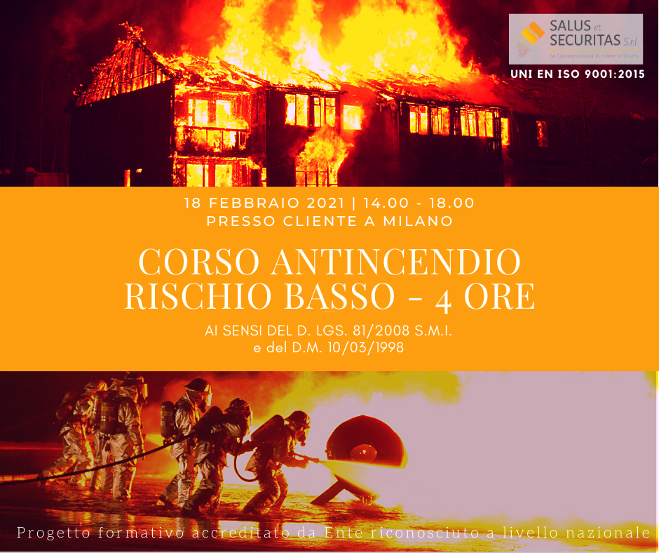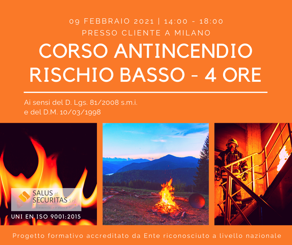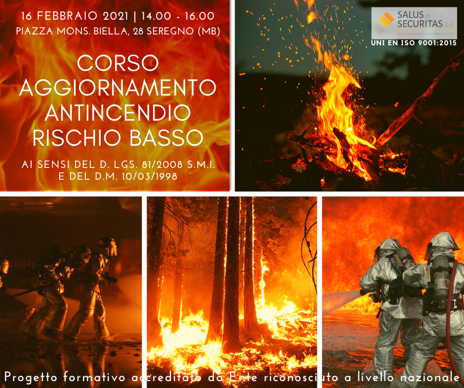 Corso Antincendio Rischio Basso della durata di 4 ore ai sensi del D. Lgs. 81/2008 s.m.i., presso la Sede Operativa e Centro Formativo di Seregno (MB), Piazza Monsignor Biella n°28 il giorno 29 Aprile 2021.