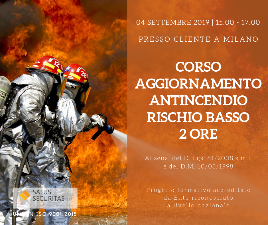 Corso Antincendio Rischio Basso della durata di 4 ore ai sensi del D. Lgs. 81/2008 s.m.i., presso Cliente a Milano il giorno 27 Settembre 2019.